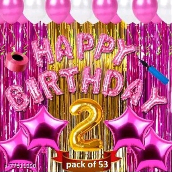Name: Second/2nd happy birthday combo/kit material for party decorations (Set of 73) Pink foil 13 balloon 4pcs pink star 3 pcs curtian pink gold + ribben + balloon pump no 2 foil balloon & matellic balloon pink white 30