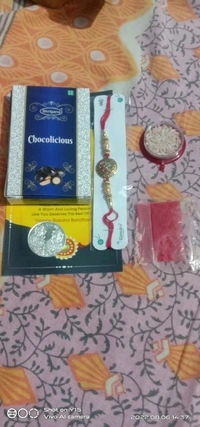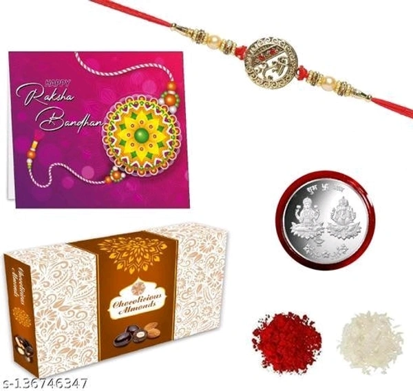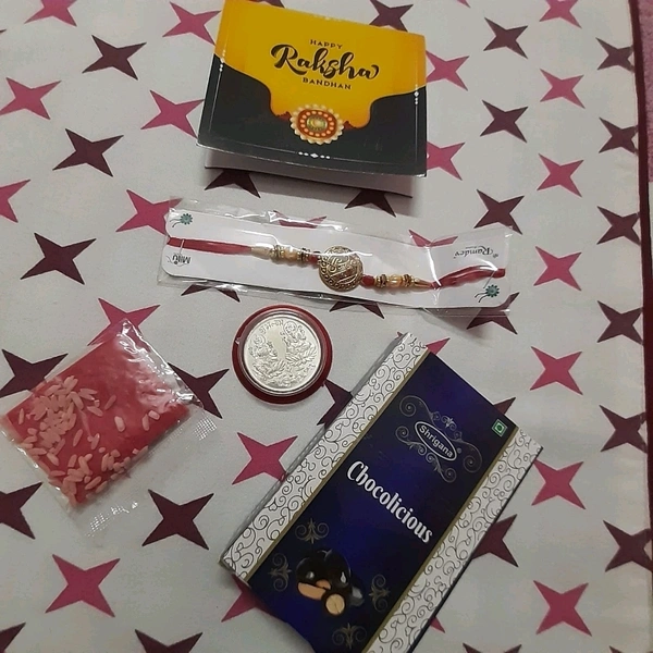 Name: Multicolor Bracelet/ Rakhi Effete Chocolate ChocoMagic 32gm with Silver Color Pooja Coin, Roli Chawal & Greeting Card | Rakhi Combo with card and chocolate | chocolates gift | Rakhi & Chocolate for brother | rakhi with gift | Set of 1 Rakhi