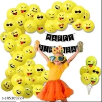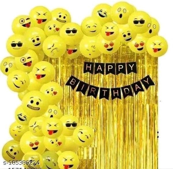 Name: Happy Birthday Decoration Combo set of 1pc Happy Birthday Black Banner, 20pcs Smiley Emoji Balloons, 2pcs Golden Fringe/Curtains