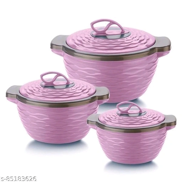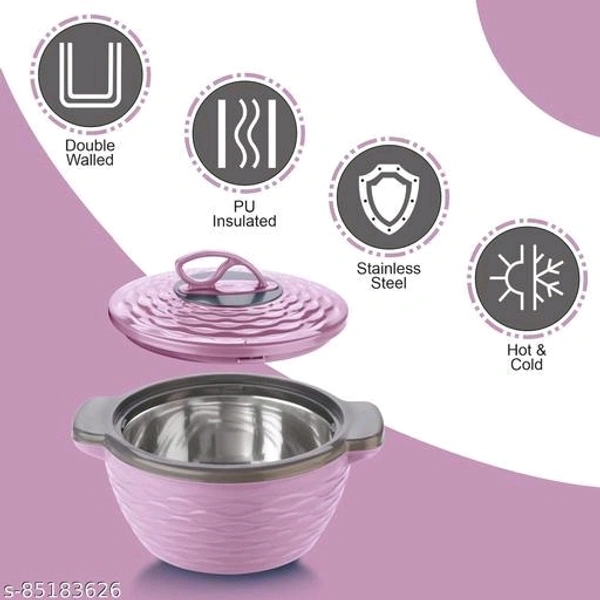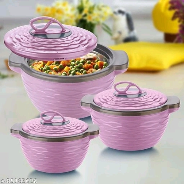 Double Walled with insulated inner stainless steel wall Twist Lock with food safe quality that keeps food fresh and hot for a longer period of time Comes in set of 3 - 1 -700ml , 1 1300ml and 1 - 2000ml to ensure your complete meal is served hot, Dishwasher Safe Easy to store, and carry around. It is ideal for its twist lock and firm grip to carry meals for outdoor picnic Integrated side handles makes it easy to carry anywhere with eye catching designs The perfect serving Casserole that comes in set to serve at any special occasions like parties or for daily use to keep your Roti/ chappati, rice or vegetables hot and fresh Due to its double insulated walls, it can be used as curd maker or ice pack storer or keep ice-cream, custard etc intact and fresh"