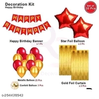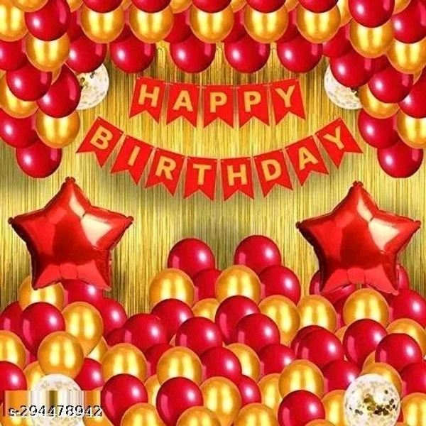 Name: Happy Birthday Decoration Combo of 33 Pcs Red Banner, 2 Gold Curtain 2 Red Star Foil Balloon And 25 Metallic Balloon 3 Confetti Balloon.