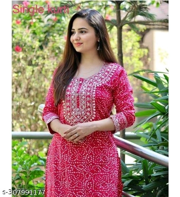 Woman Rayon Straight Round Neck Bandani Print Kurta , 3/4 Sleeves , Kurta Length - 3/4 , Embroidery Work On Neck ,