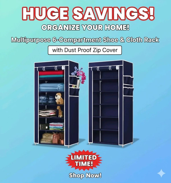 Multipurpose 6- compartment shoe, cloth rack, with Dust Proof Zip Cover, Multiuse wide space storage rack