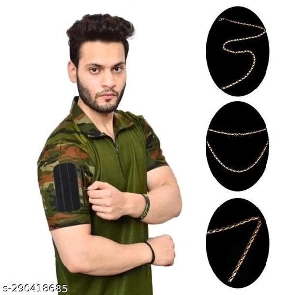 The men's T-shirt with a complementary golden plated chain offers a stylish and coordinated ensemble that effortlessly combines casual comfort with a touch of sophistication. Here's a description of this ensemble: